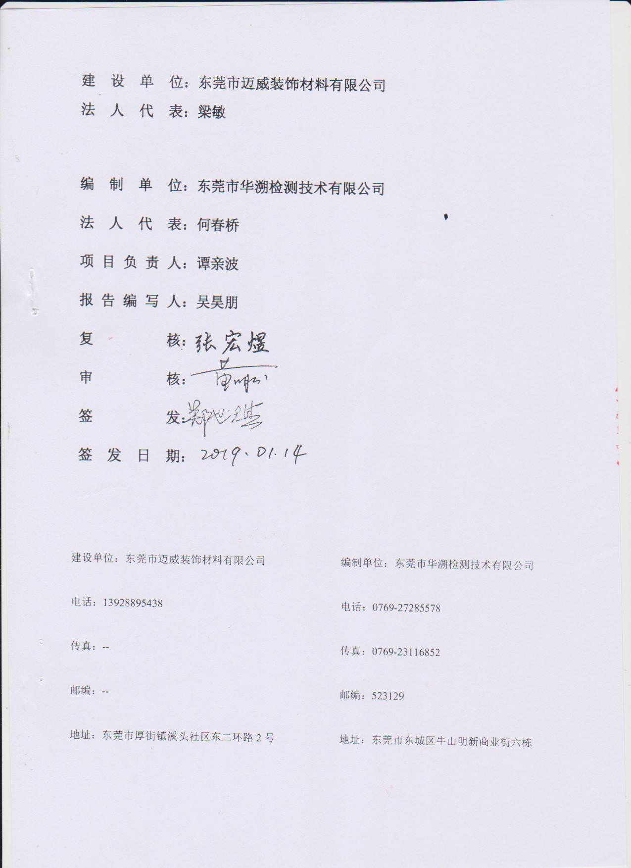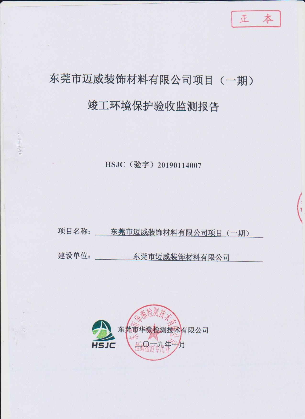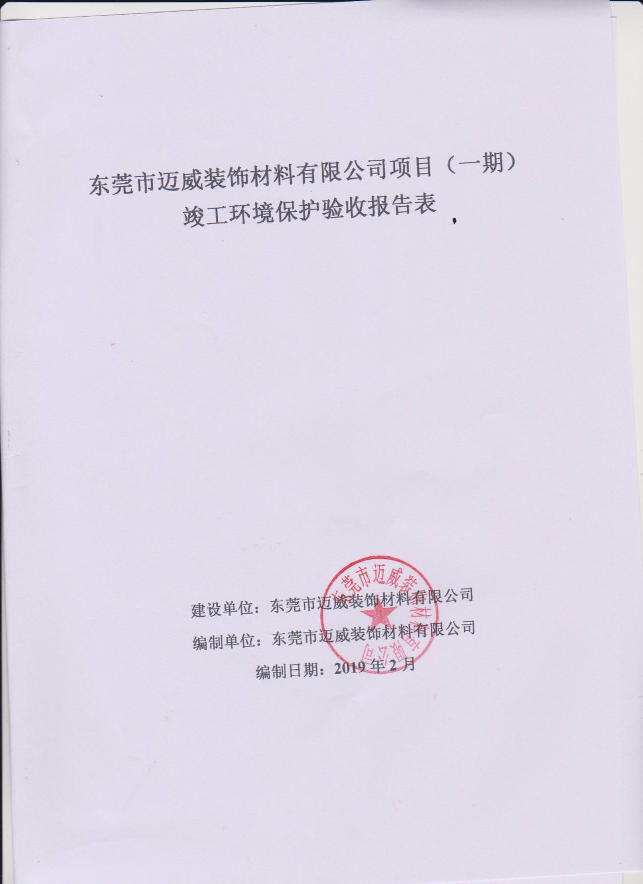 经验收现形成“东莞市迈威装饰材料有限公司生产项目竣工环境保护验收报告”现公开征求意见20个工作日,如有意见请反馈。 联系人:李聪,联系电话:18814145807,公示日期:2019年3月15日