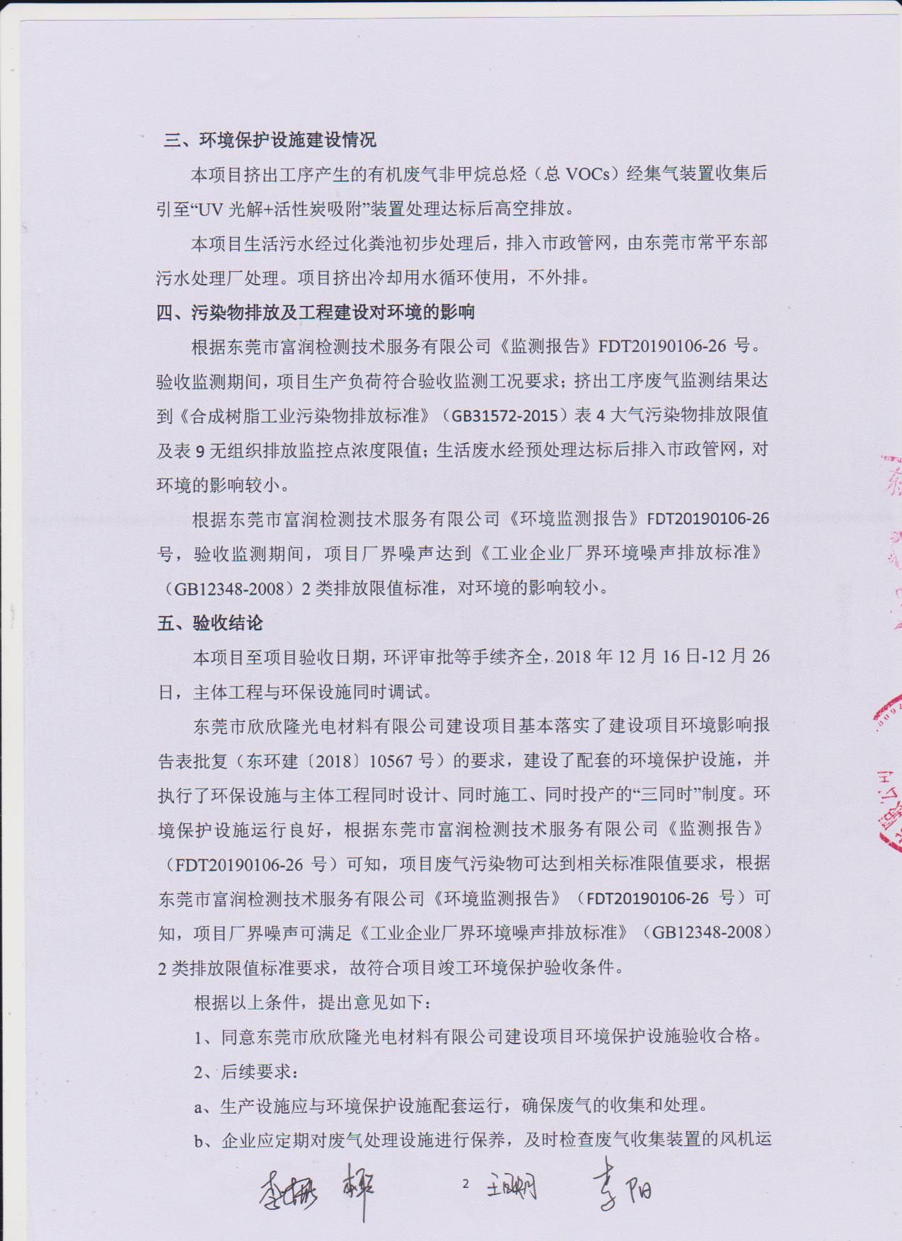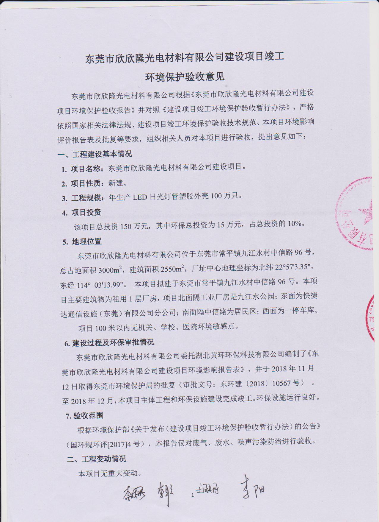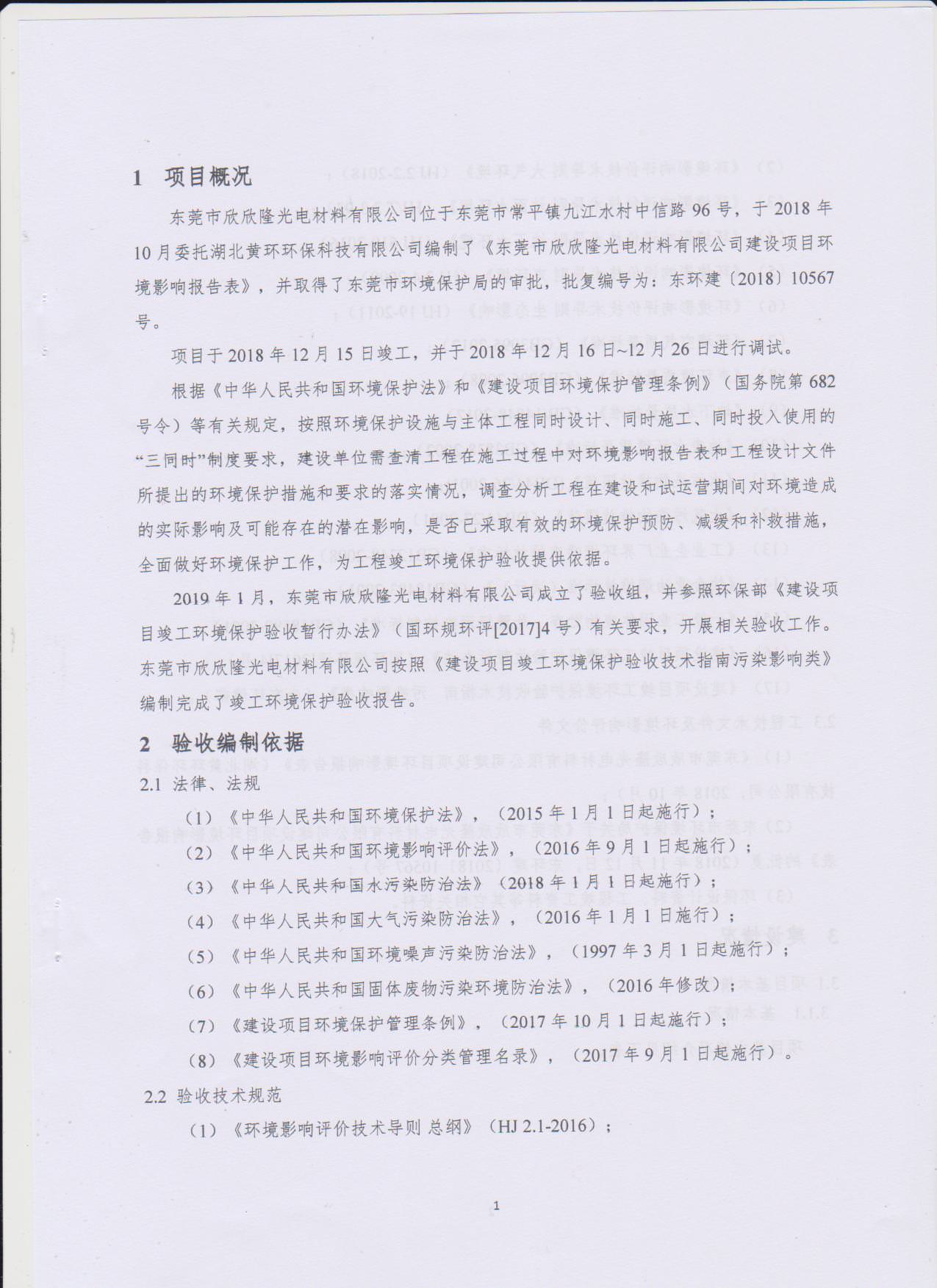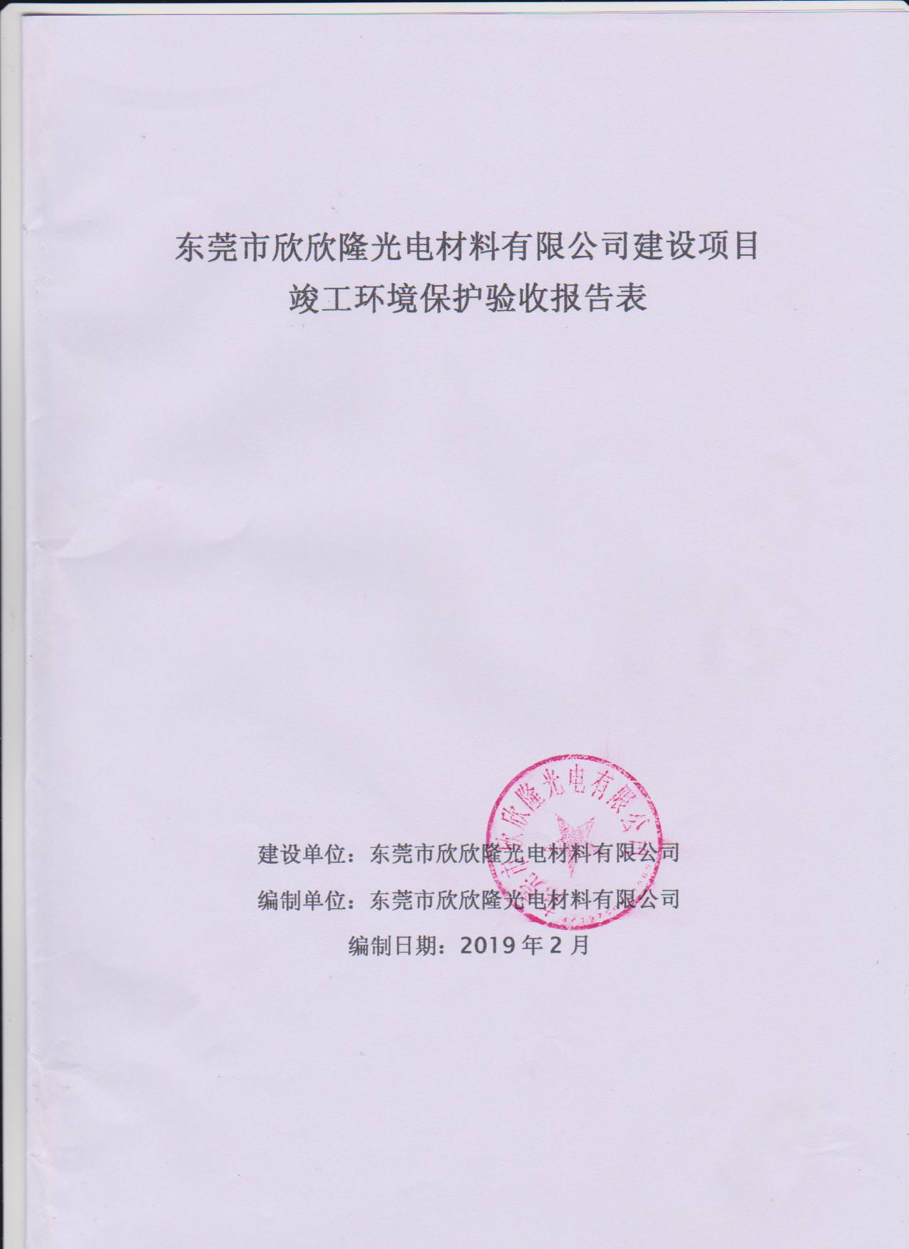 验收现形成“东莞市欣欣隆光电材料有限公司建设项目竣工环境保护验收报告”现公开征求意见20个工作日,如有意见请反馈。 联系人:李聪,联系电话:18814145807,公示日期:2019年2月1日