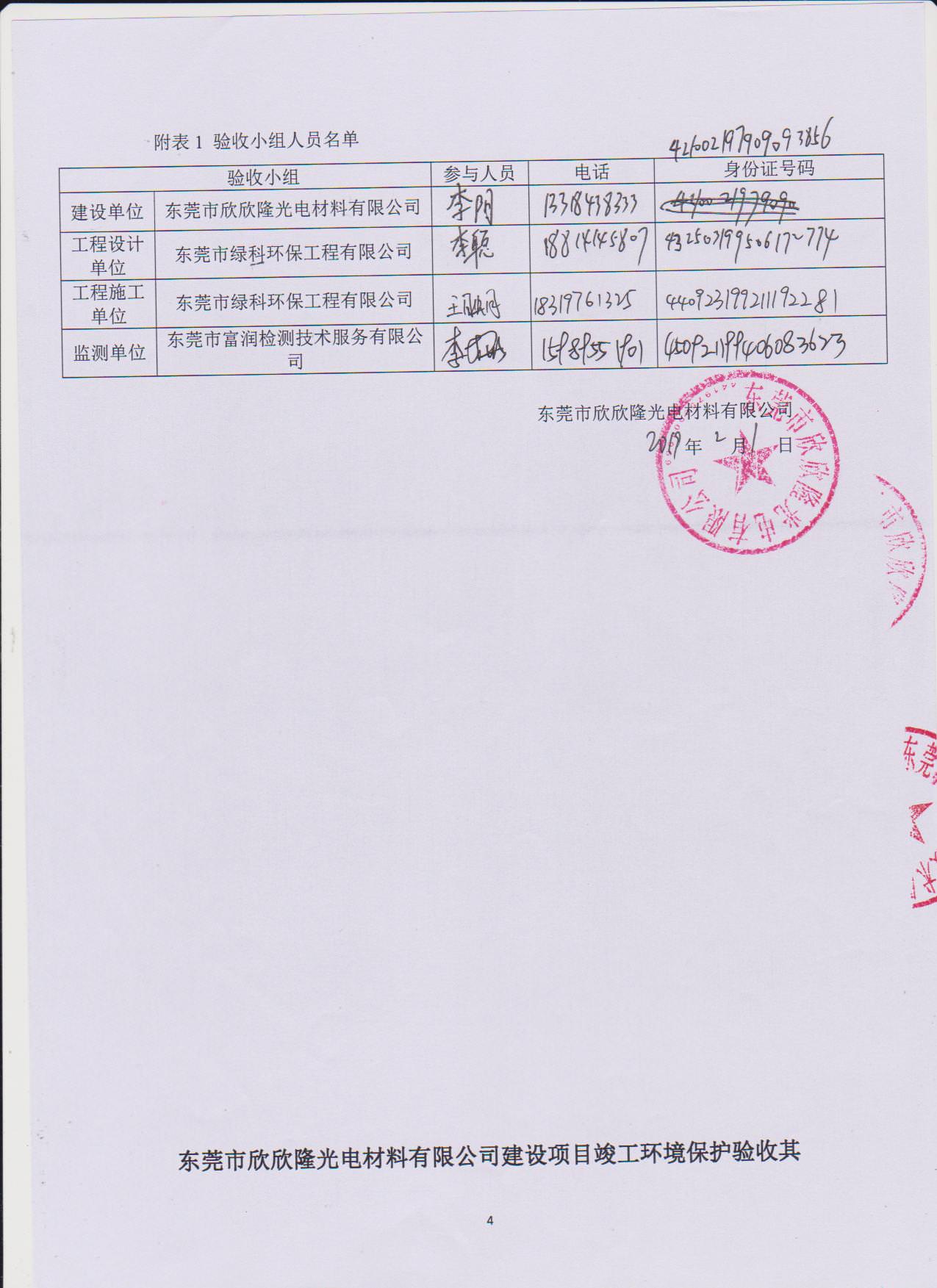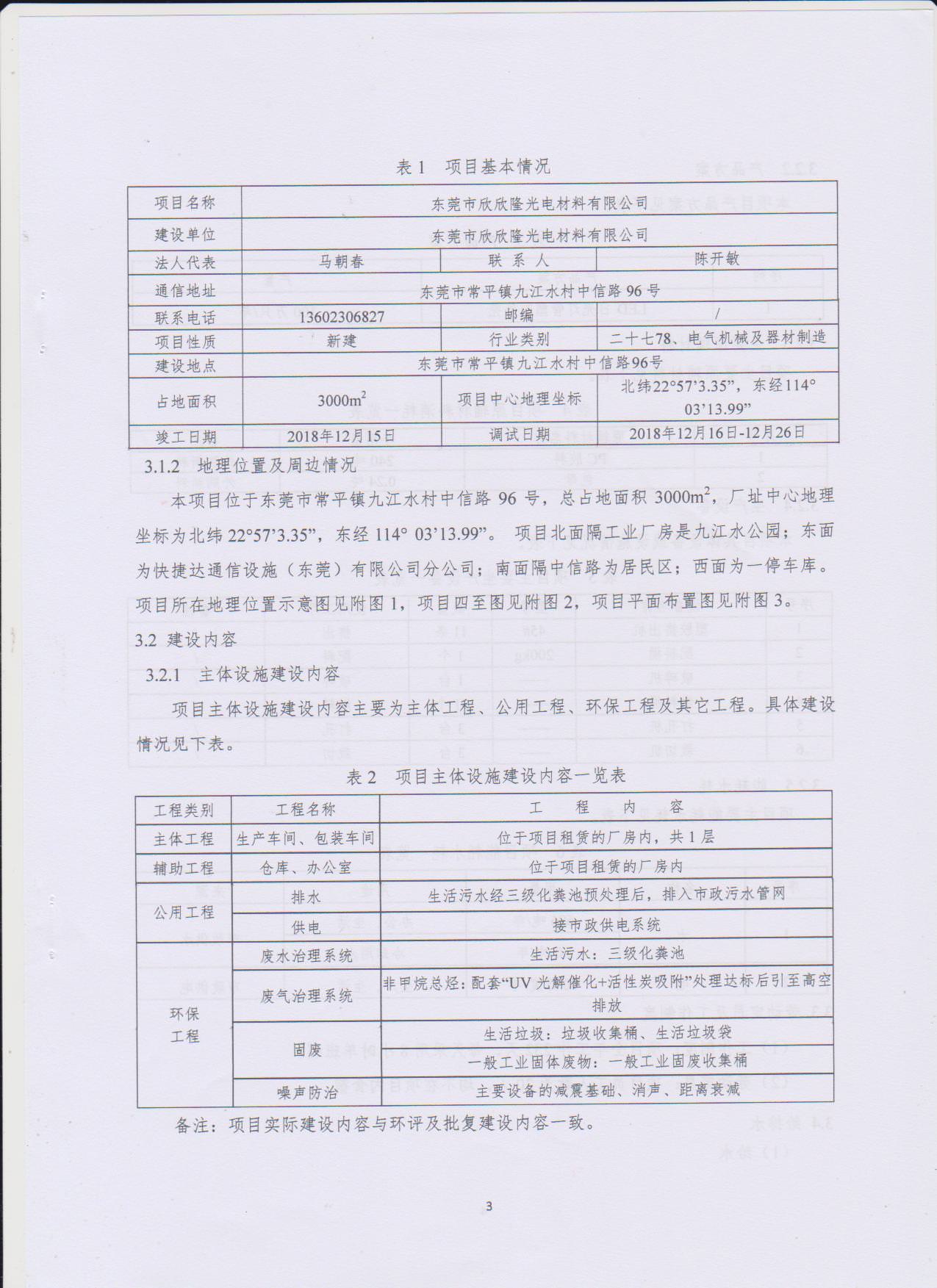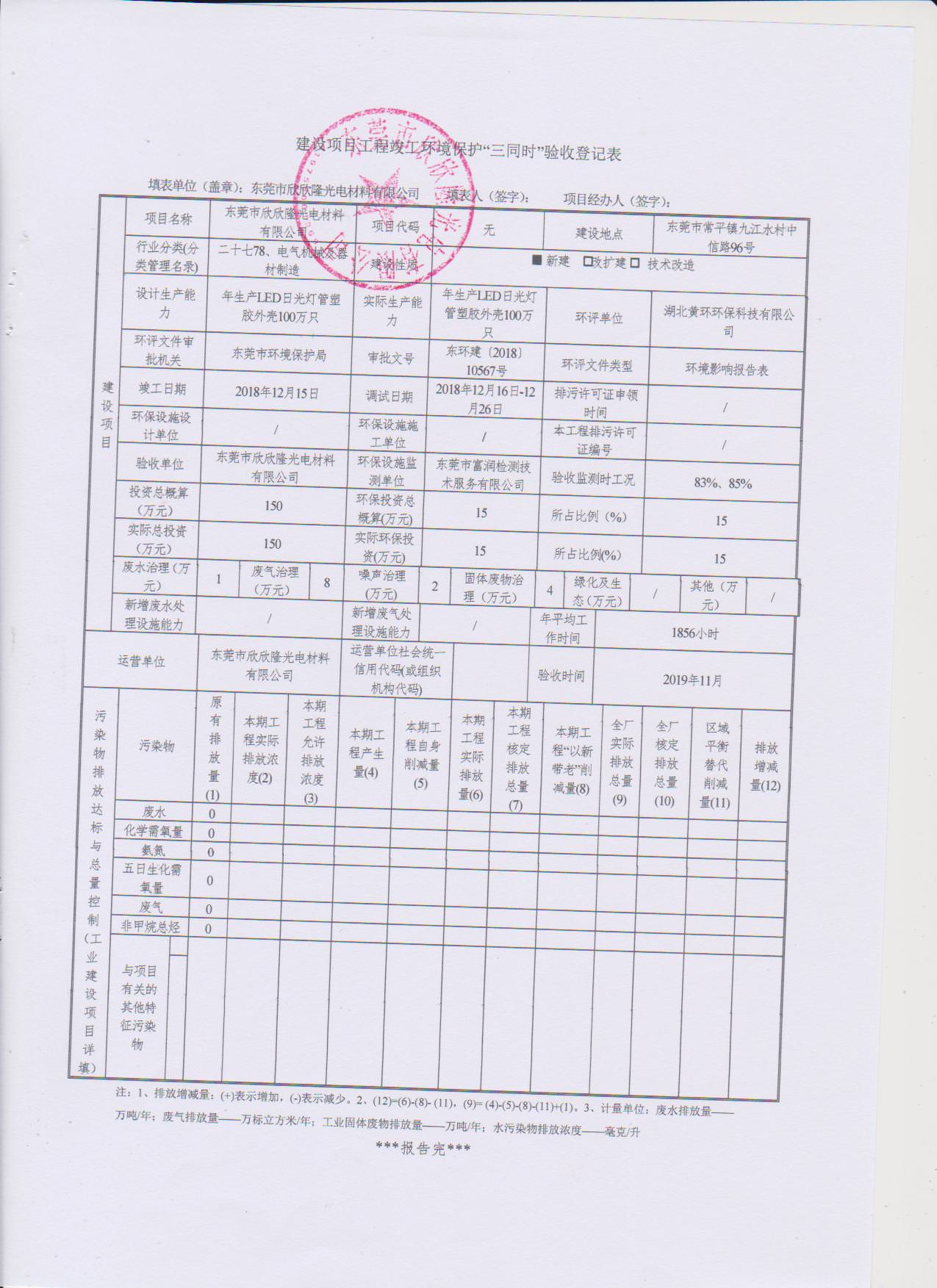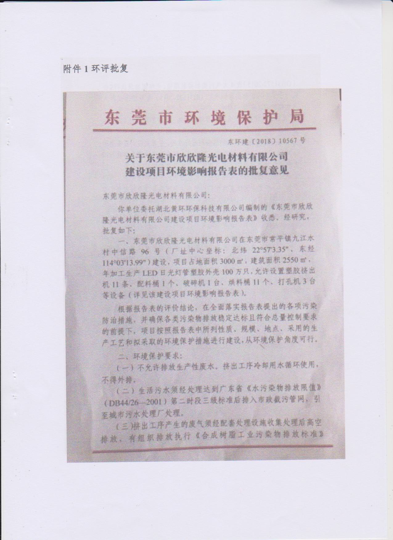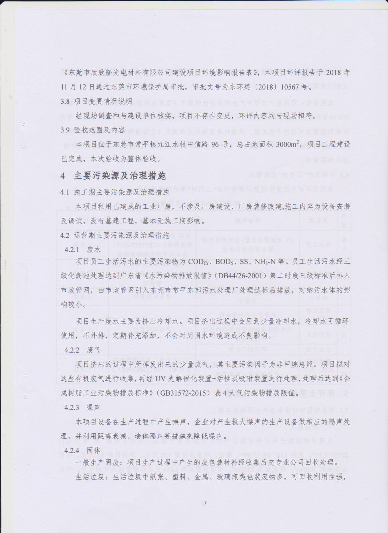 验收现形成“东莞市欣欣隆光电材料有限公司建设项目竣工环境保护验收报告”现公开征求意见20个工作日,如有意见请反馈。 联系人:李聪,联系电话:18814145807,公示日期:2019年2月1日