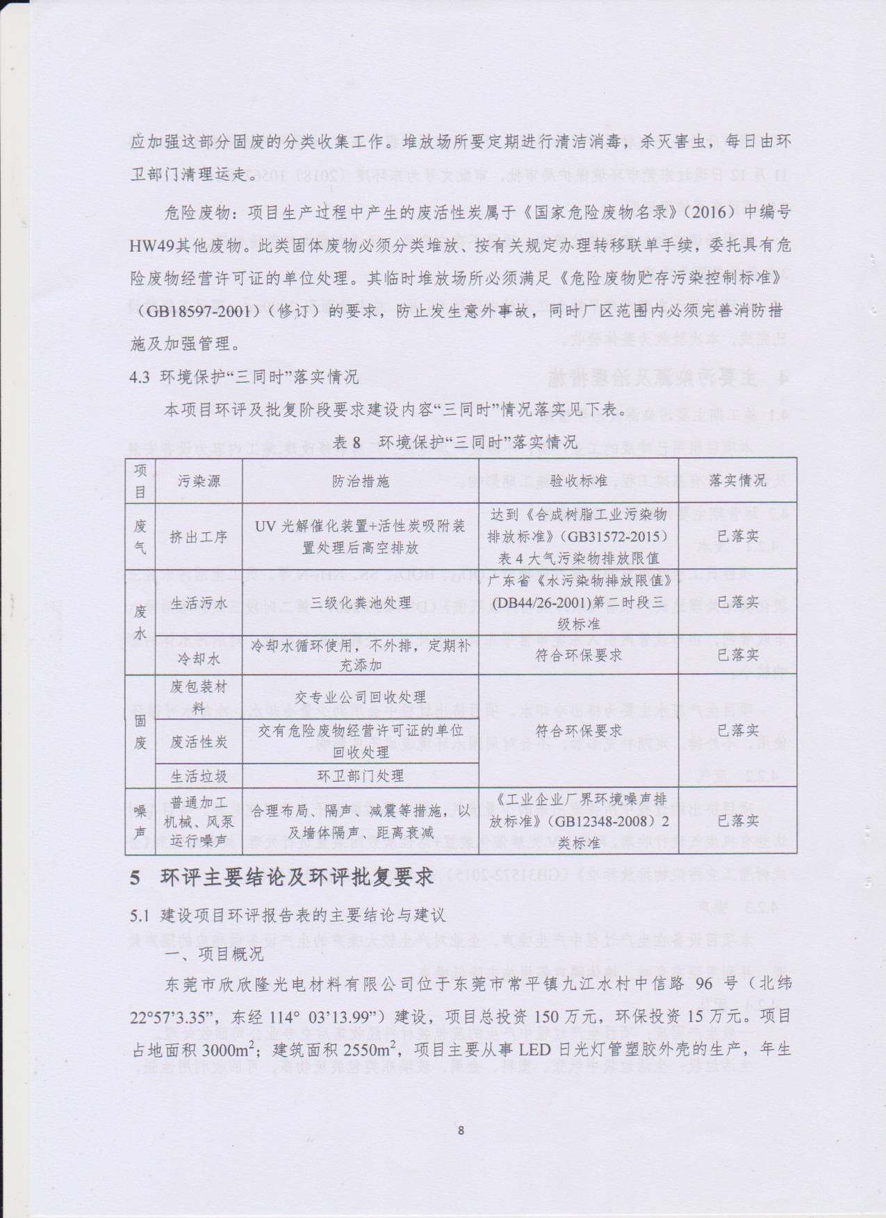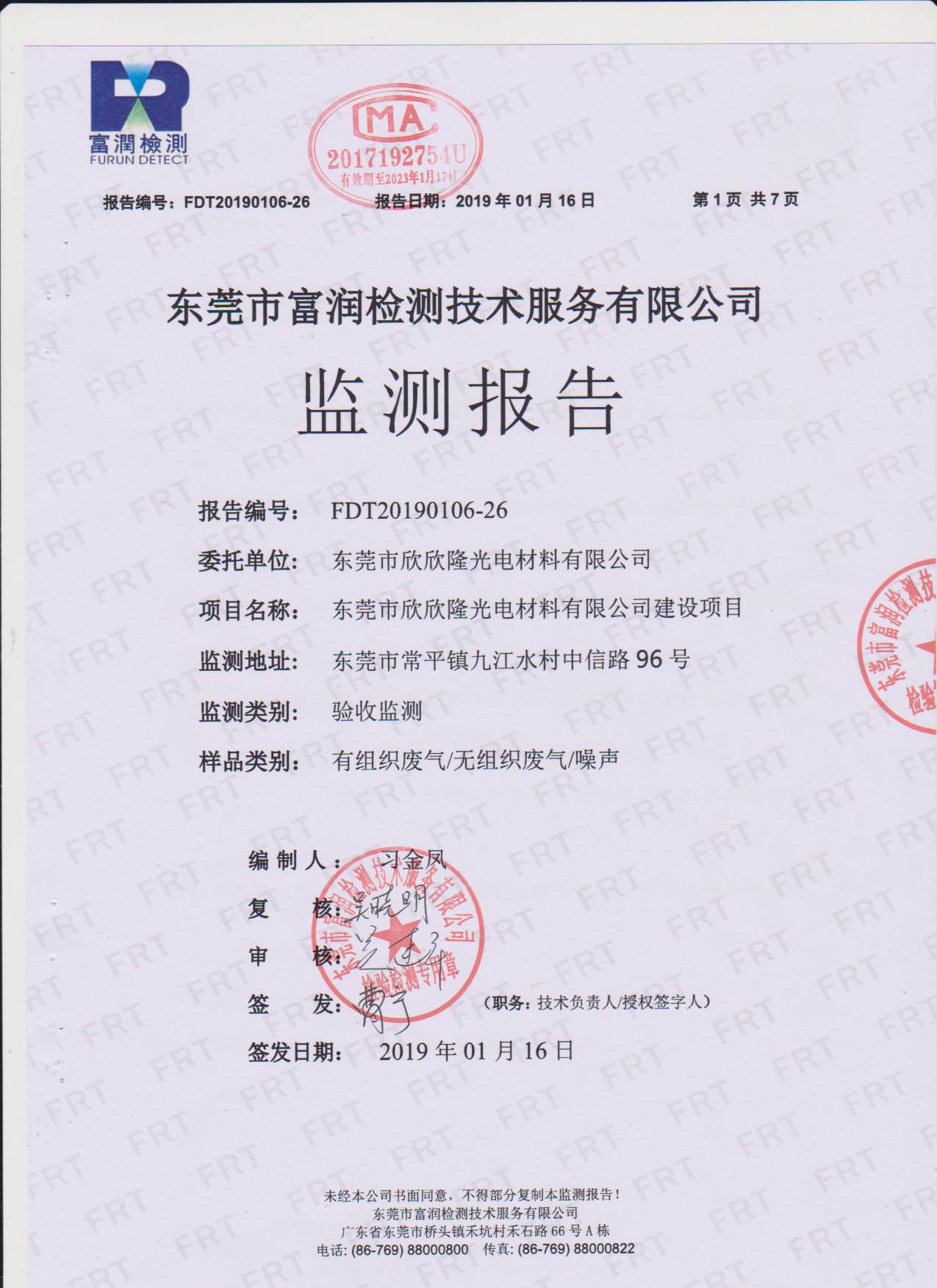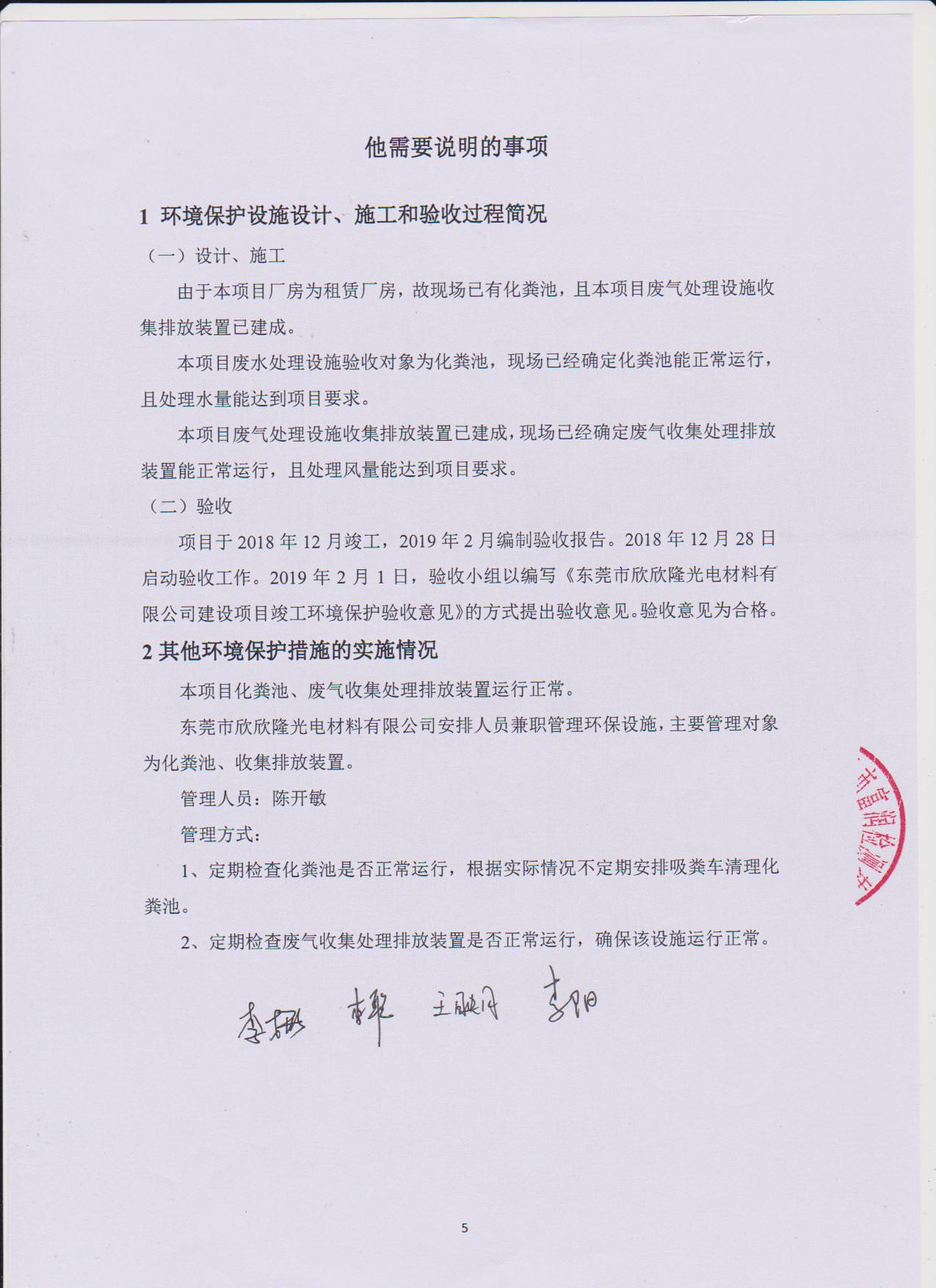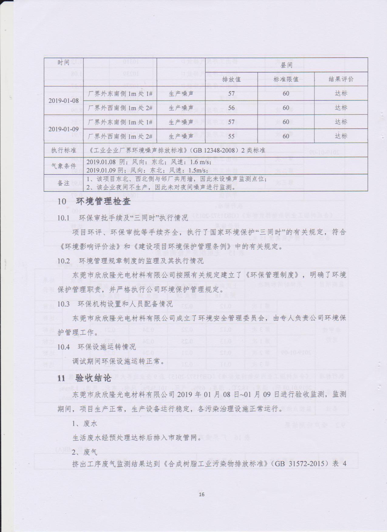 验收现形成“东莞市欣欣隆光电材料有限公司建设项目竣工环境保护验收报告”现公开征求意见20个工作日,如有意见请反馈。 联系人:李聪,联系电话:18814145807,公示日期:2019年2月1日