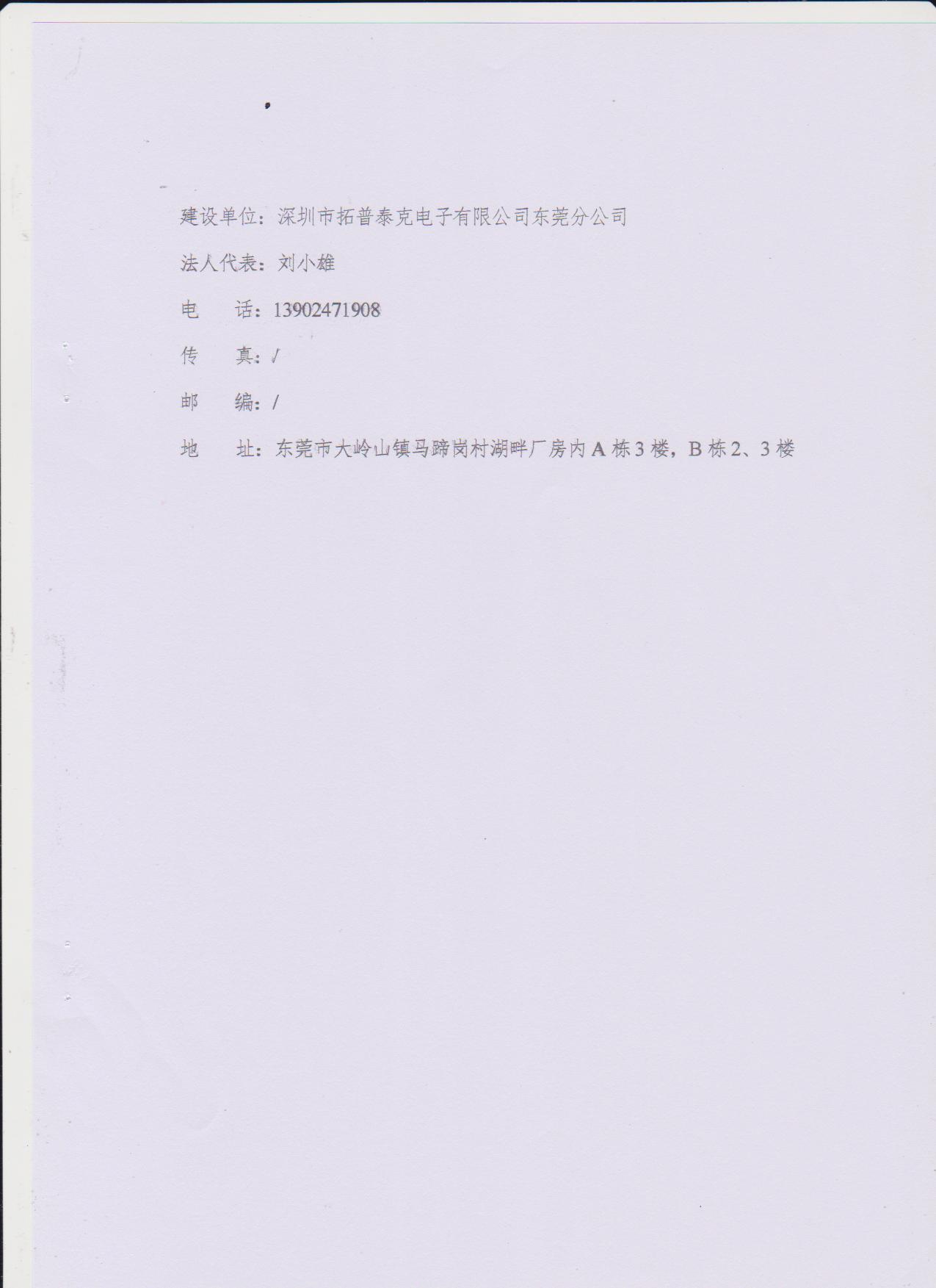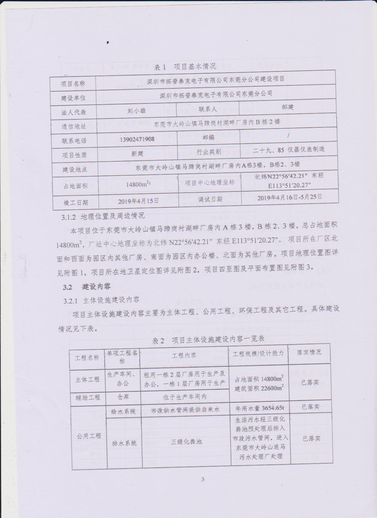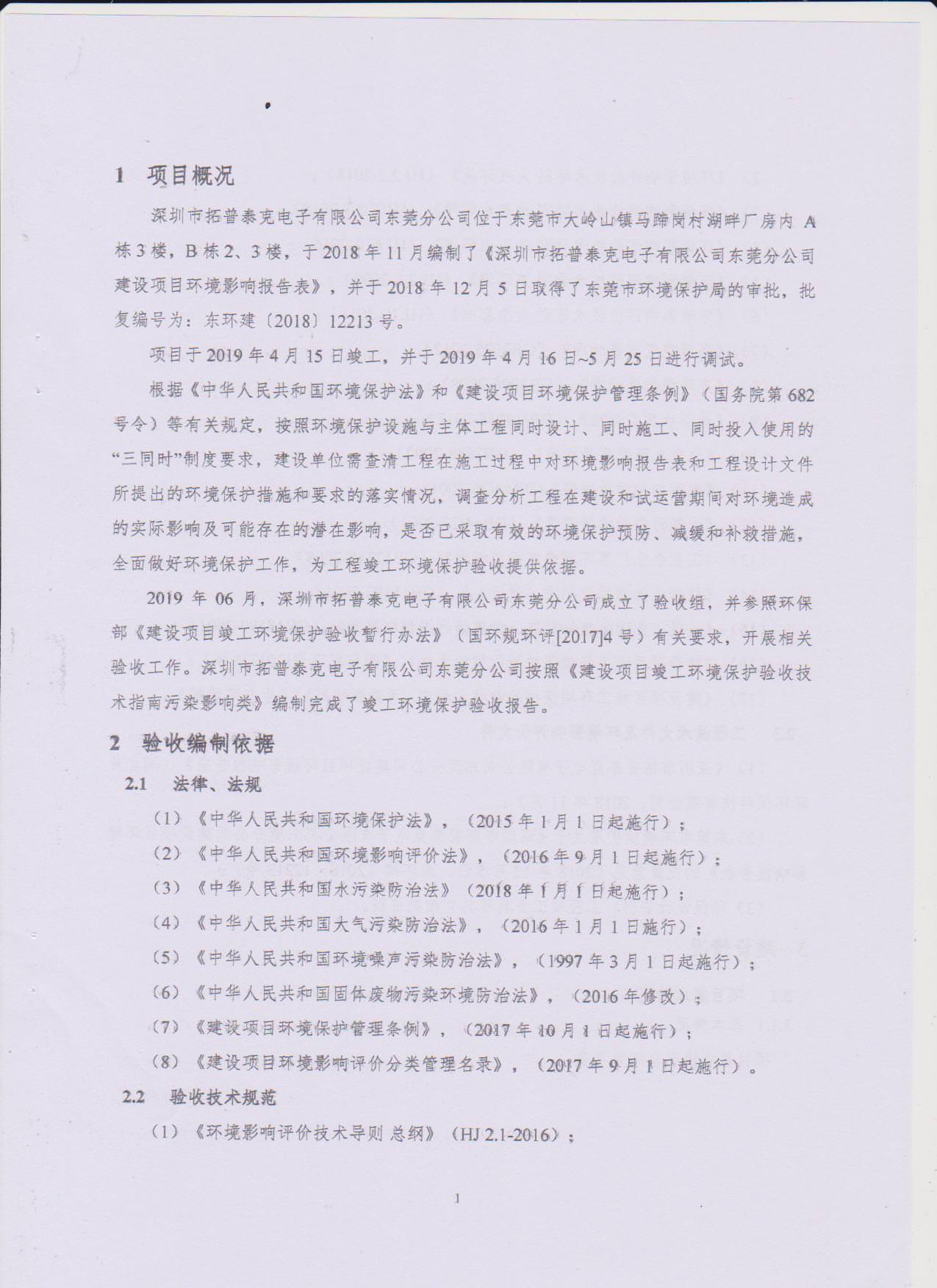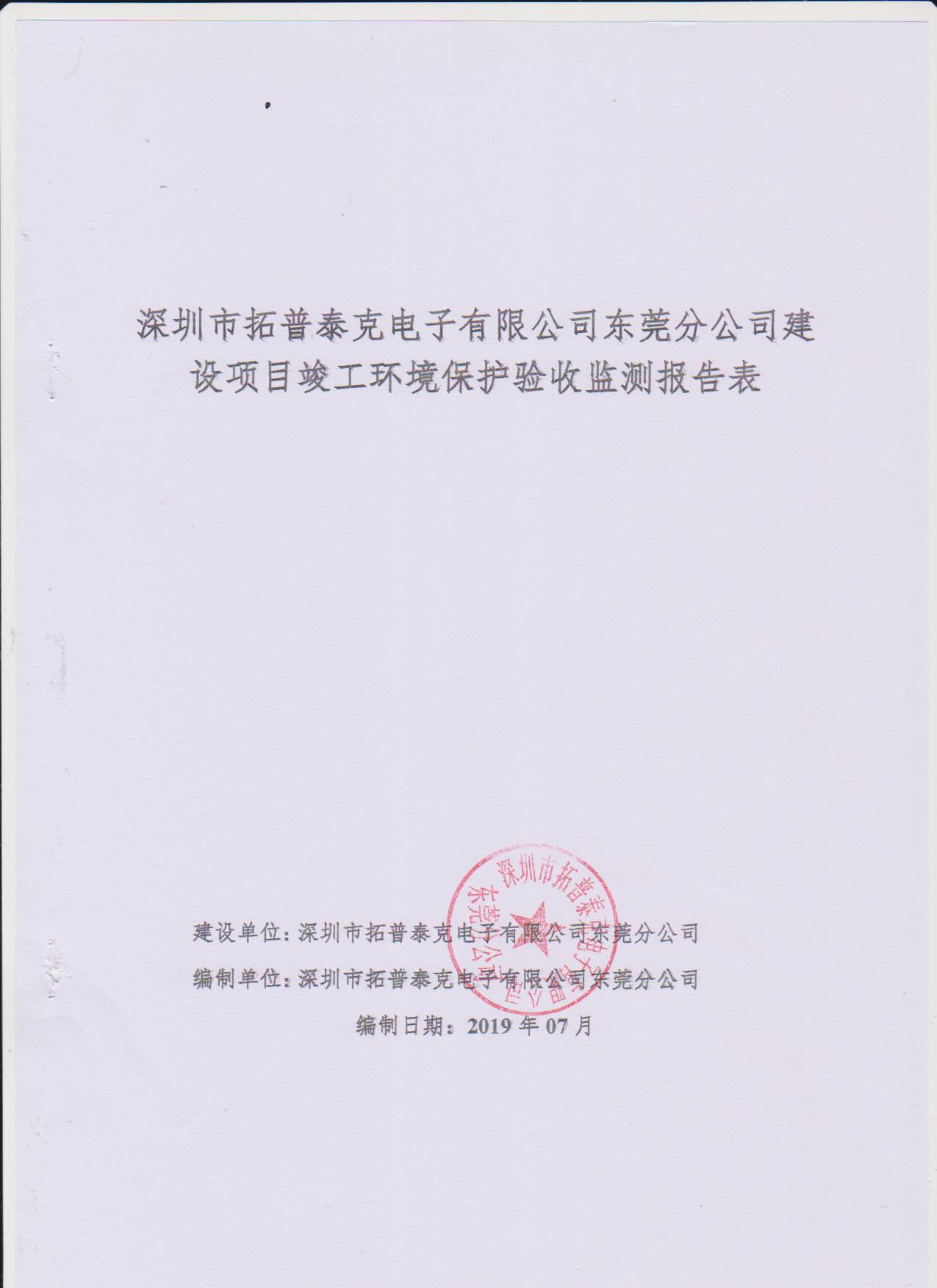 验收现形成“深圳市拓普泰克电子有限公司东莞分公司建设项目竣工环境保护验收报告”现公开征求意见20个工作日,如有意见请反馈。 联系人:李聪,联系电话:18814145807,公示日期:2019年7月26日