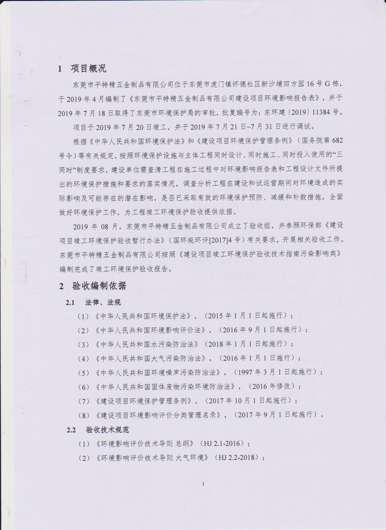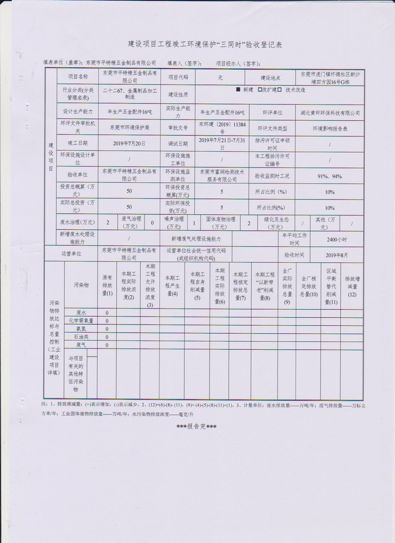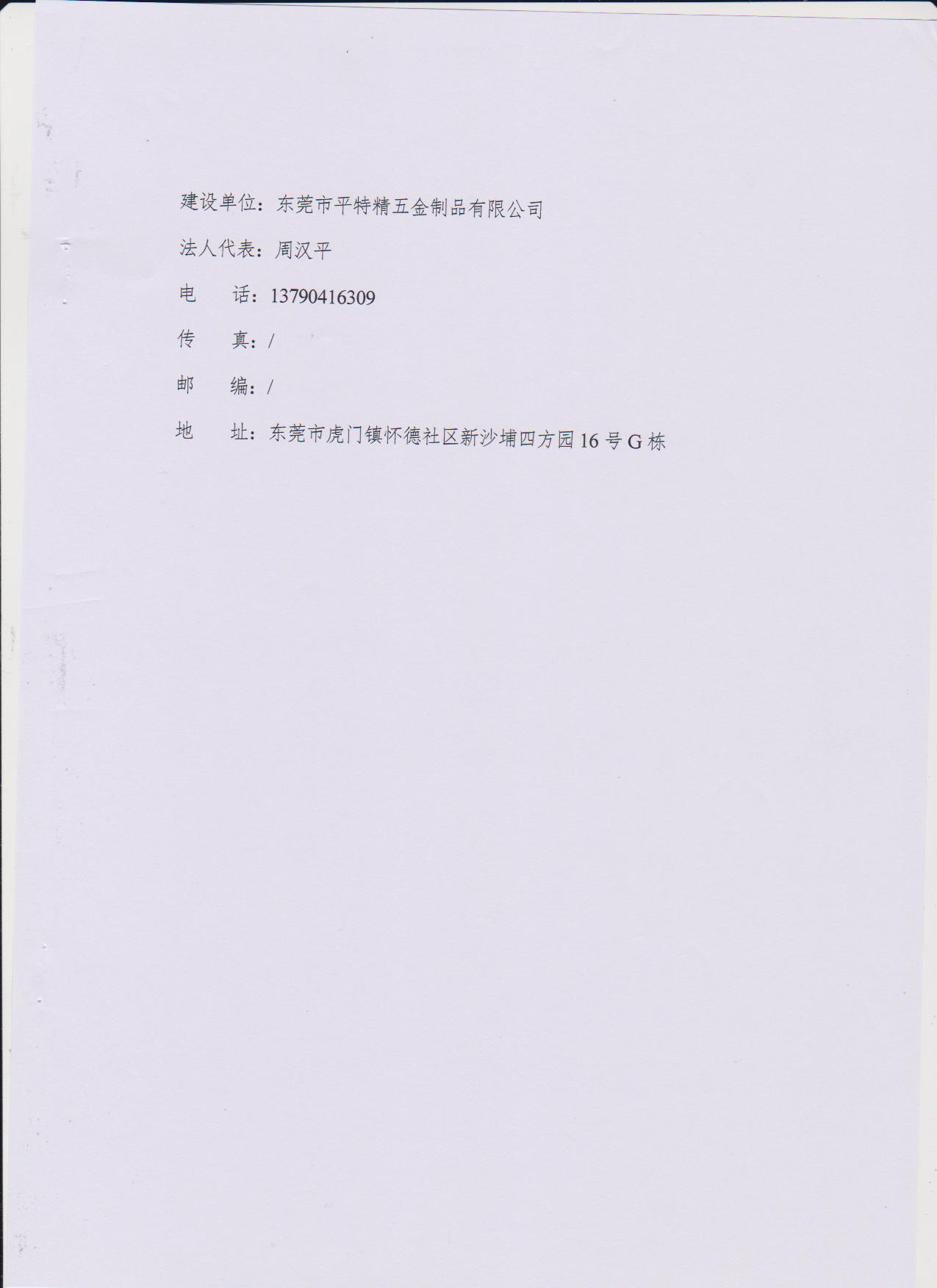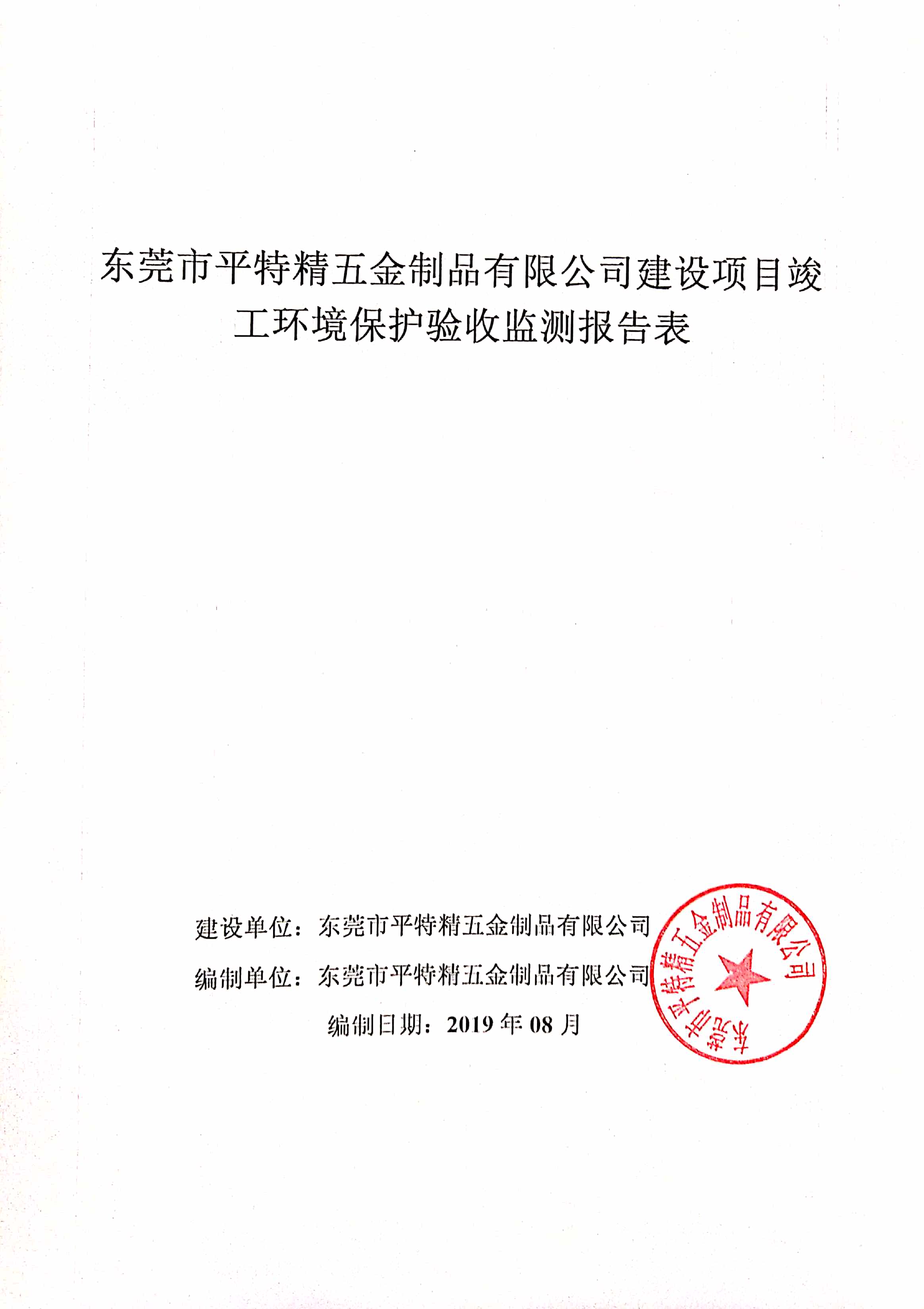 经验收现形成东莞市平特精五金制品有限公司建设项目竣工环境保护验收报告”现公开征求意见20个工作日,如有意见请反馈。 联系人:李聪,联系电话:18814145807,公示日期:2019年9月03日