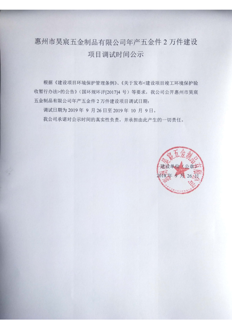 惠州市昊辰五金制品有限公司年产五金件2万件建设项目调试时间公示