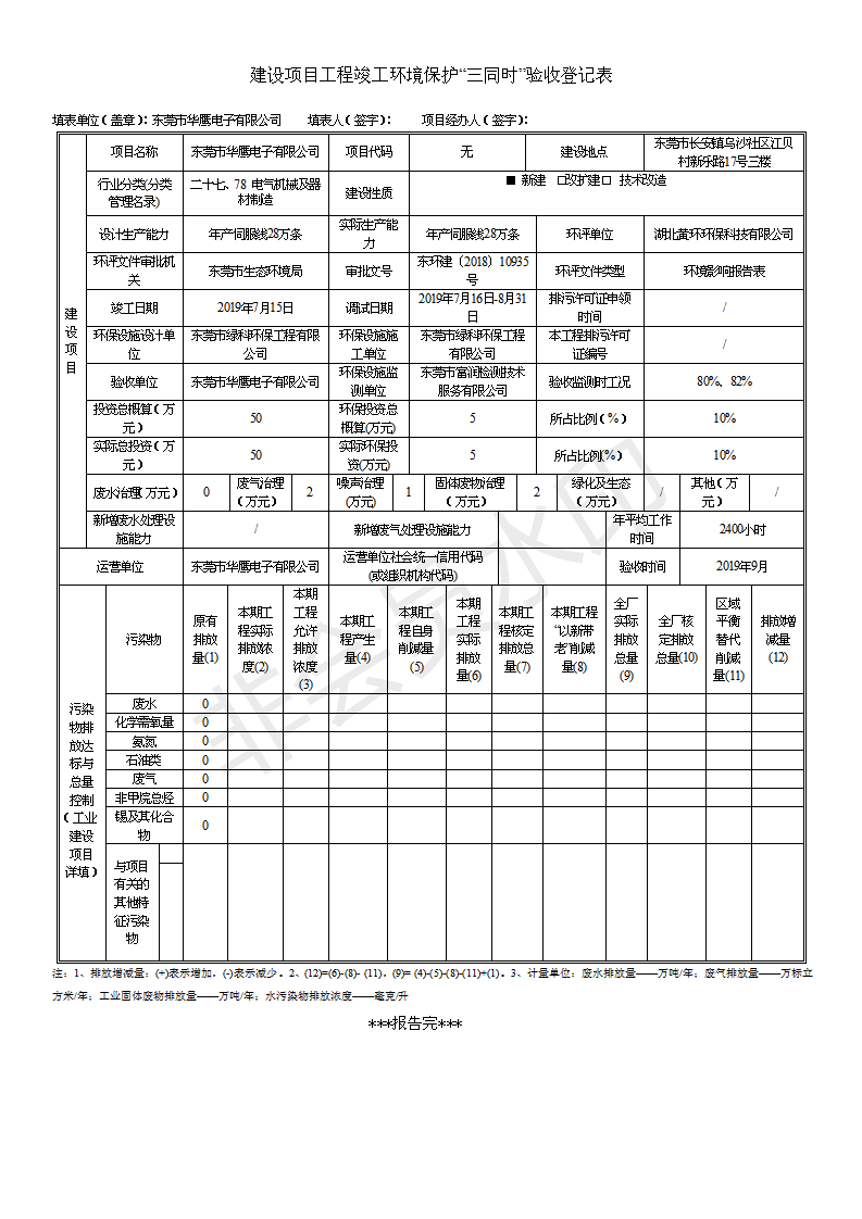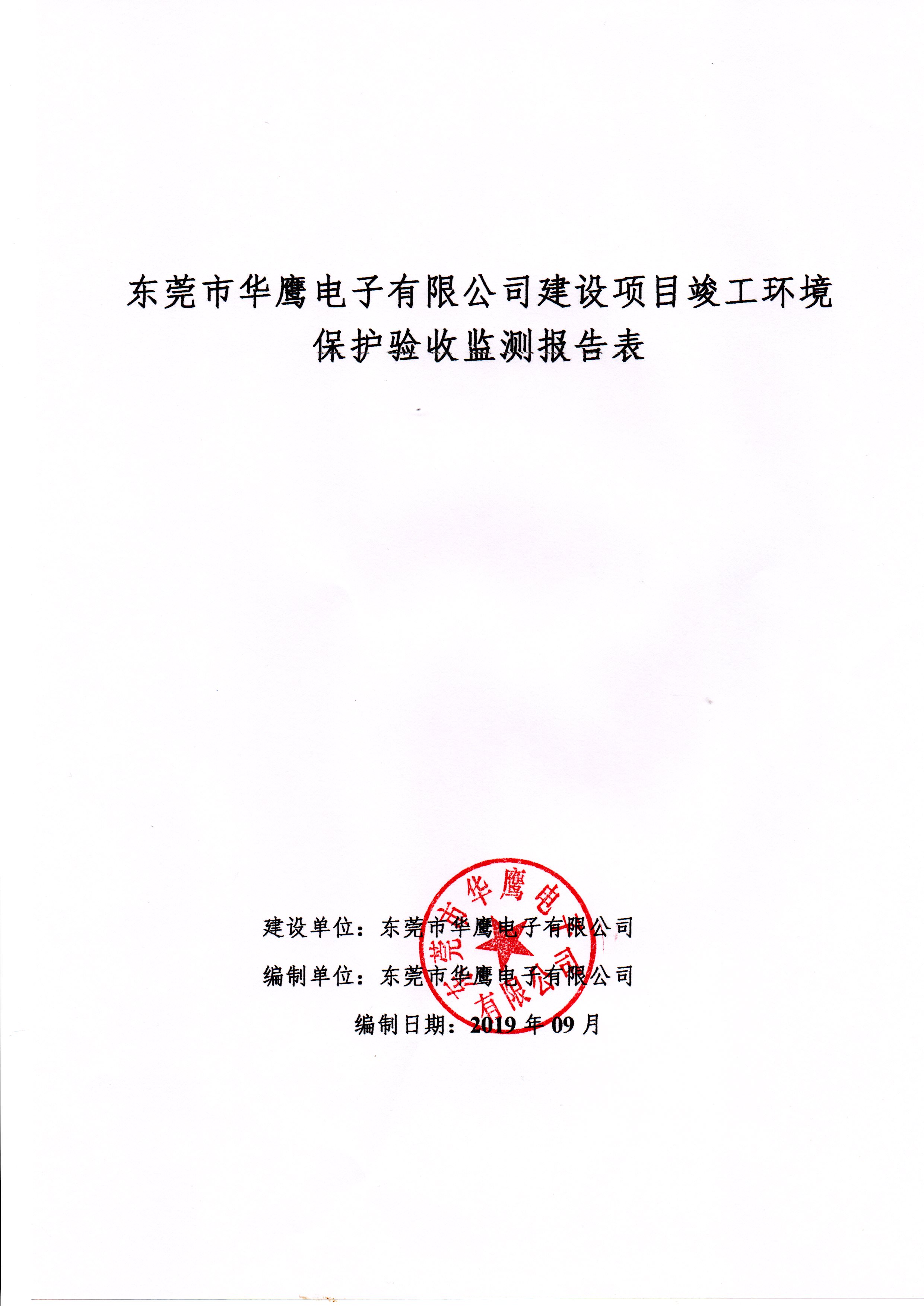 经验收现形成东莞市华鹰电子有限公司建设项目竣工环境保护验收报告”现公开征求意见20个工作日,如有意见请反馈。 联系人:李聪,联系电话:18814145807,公示日期:2019年10月10日
