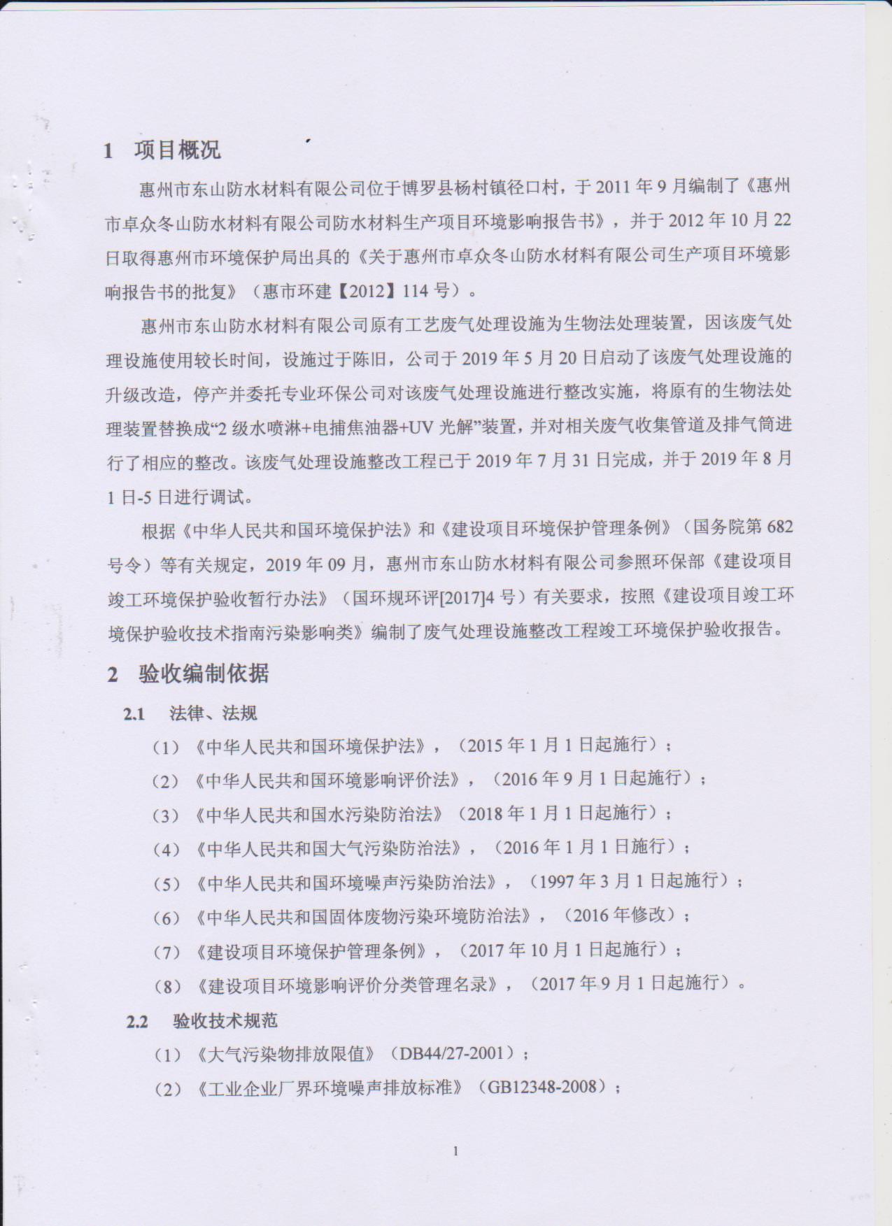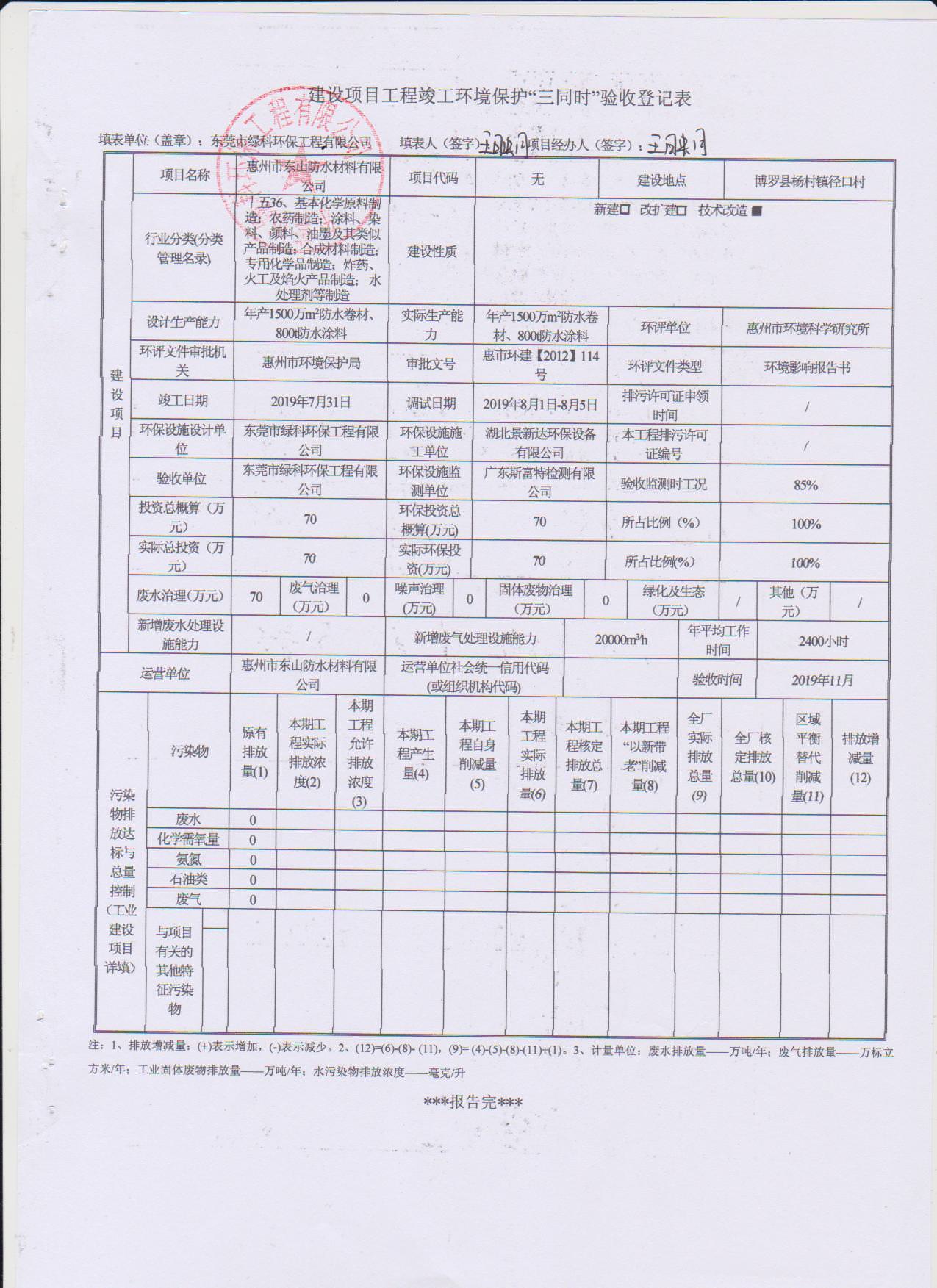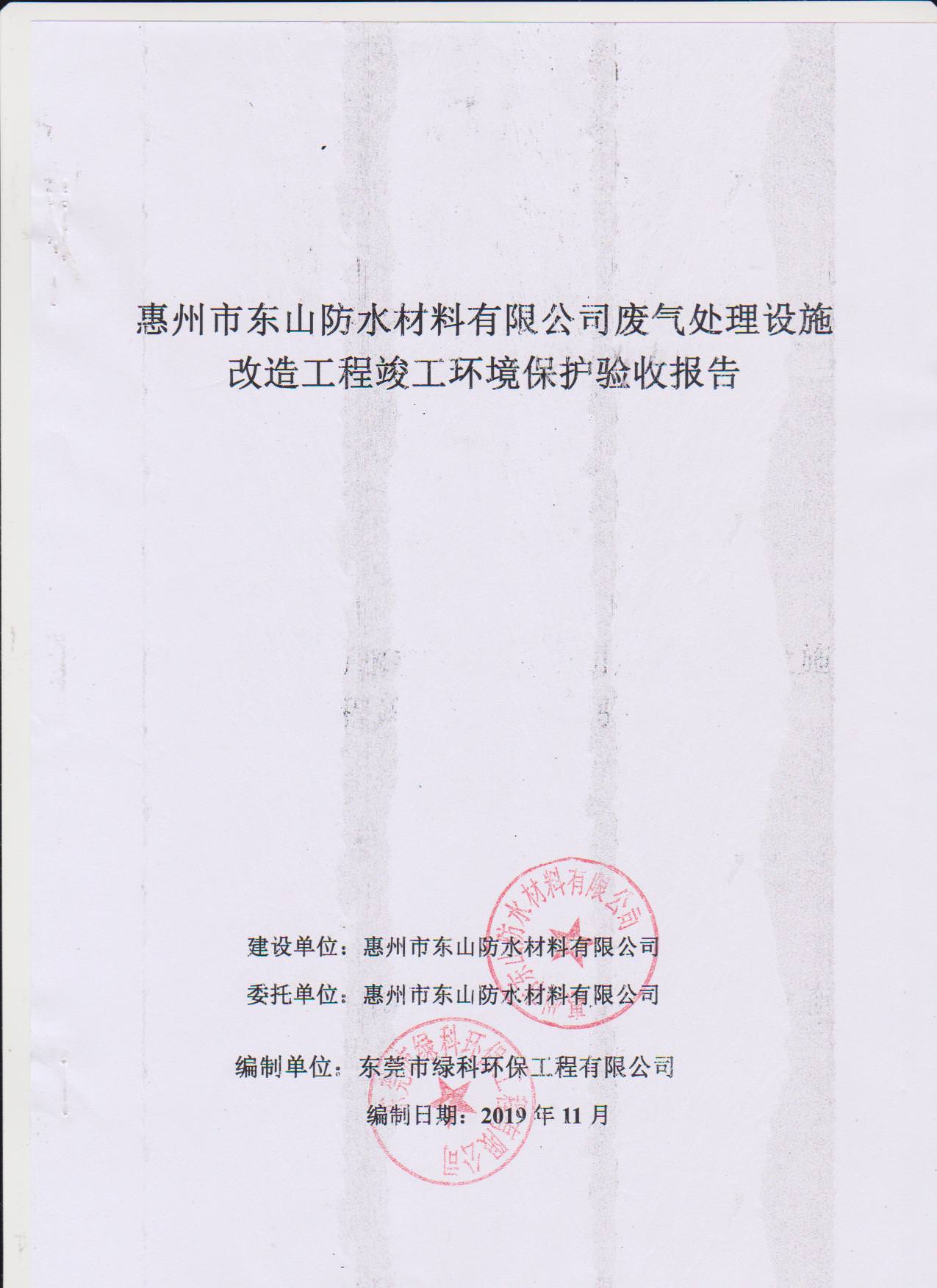 经验收现形成惠州市东山防水材料有限公司建设项目竣工环境保护验收报告”现公开征求意见20个工作日,如有意见请反馈。 联系人:李聪,联系电话:18814145807,公示日期:2019年11月18日