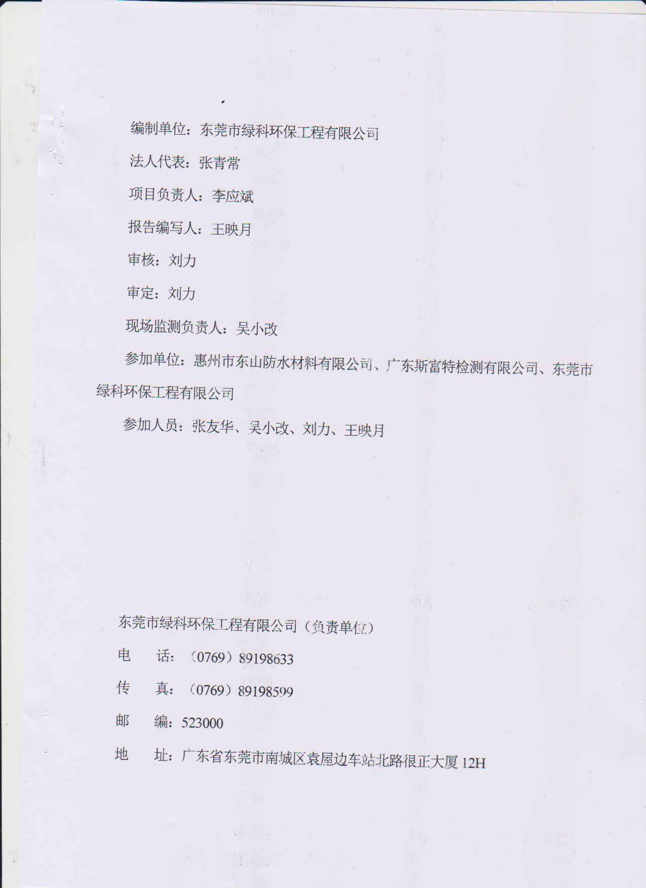 公司名称:东莞市绿科环保工程有限公司 地址:广东省东莞市南城区袁屋边车站北路恒正大厦12F 手机:13790562867 直线:0769-89198366 传真:0769-89198599