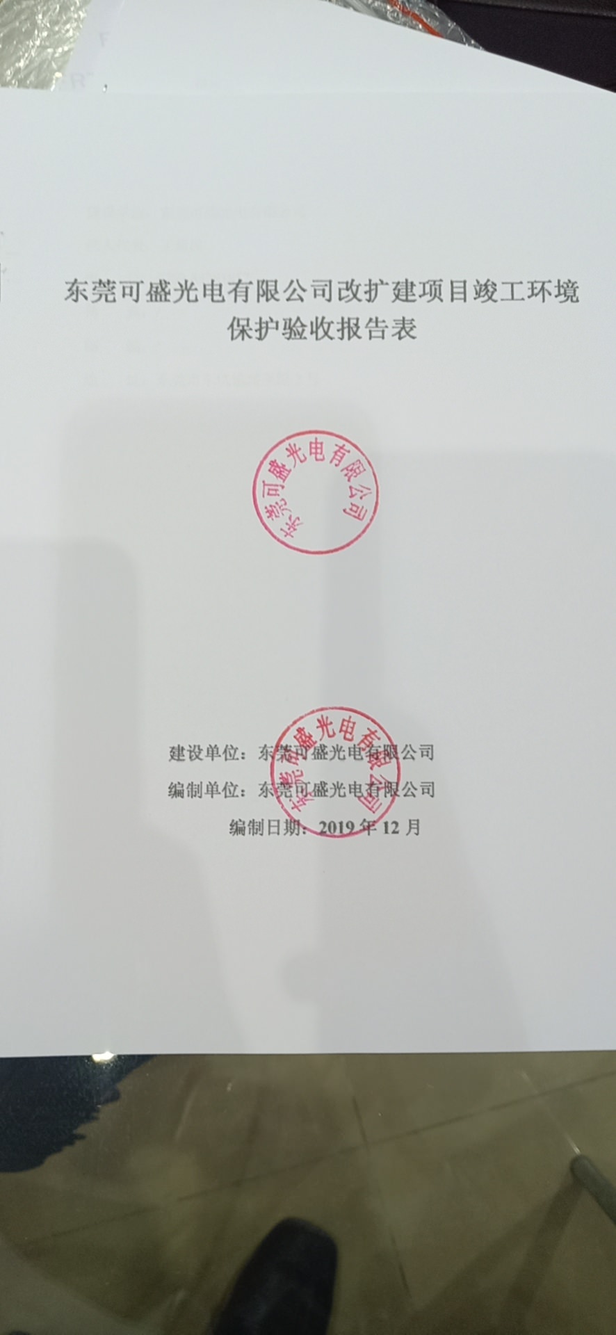 经验收现形成东莞可盛光电有限公司建设项目竣工环境保护验收报告”现公开征求意见20个工作日,如有意见请反馈。 联系人:李聪,联系电话:18814145807,公示日期:2019年12月23日