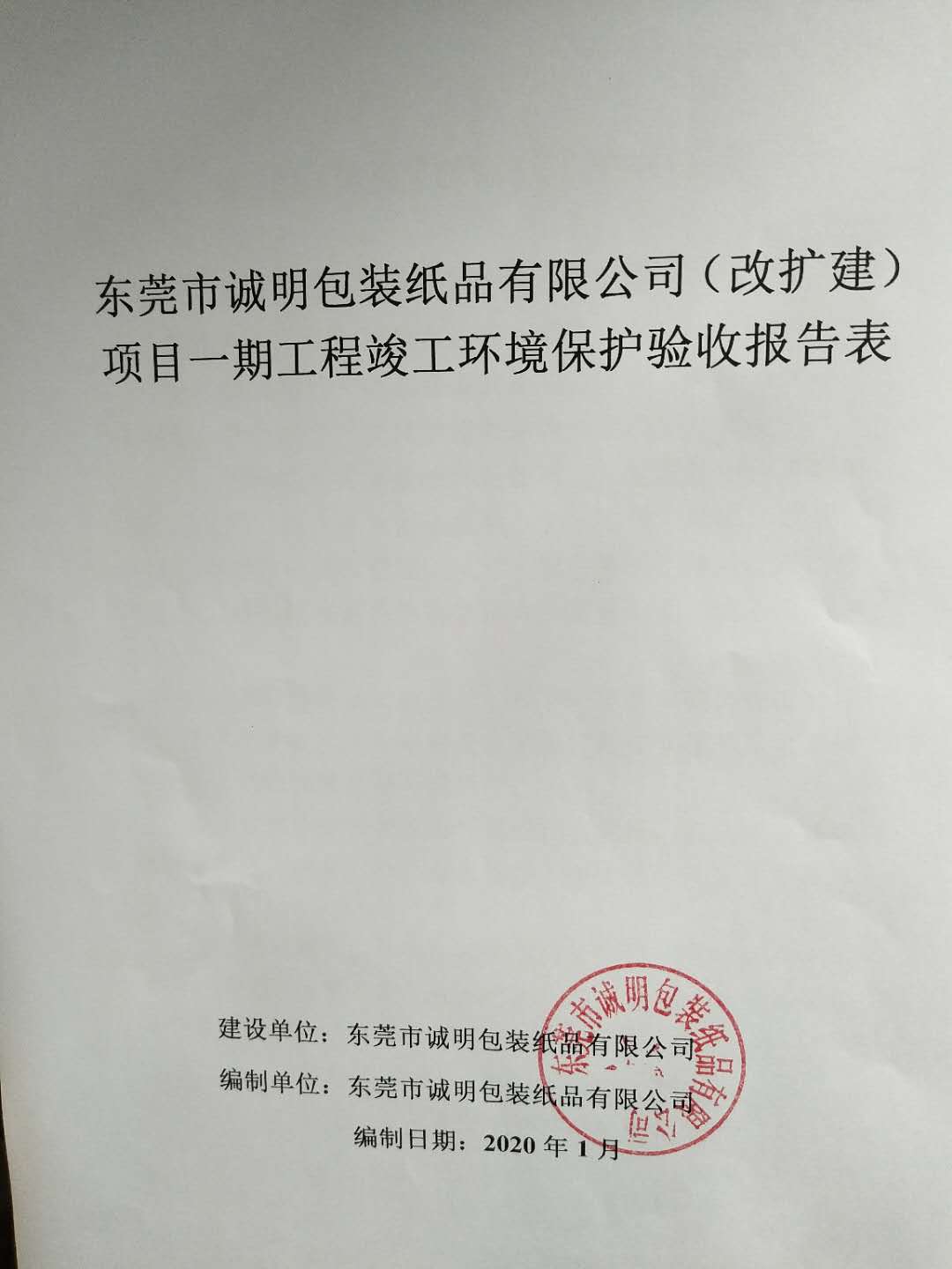 经验收现形成东莞市诚明包装纸品有限公司建设项目竣工环境保护验收报告”现公开征求意见20个工作日,如有意见请反馈。 联系人:李聪,联系电话:18814145807,公示日期:2020年4月10日