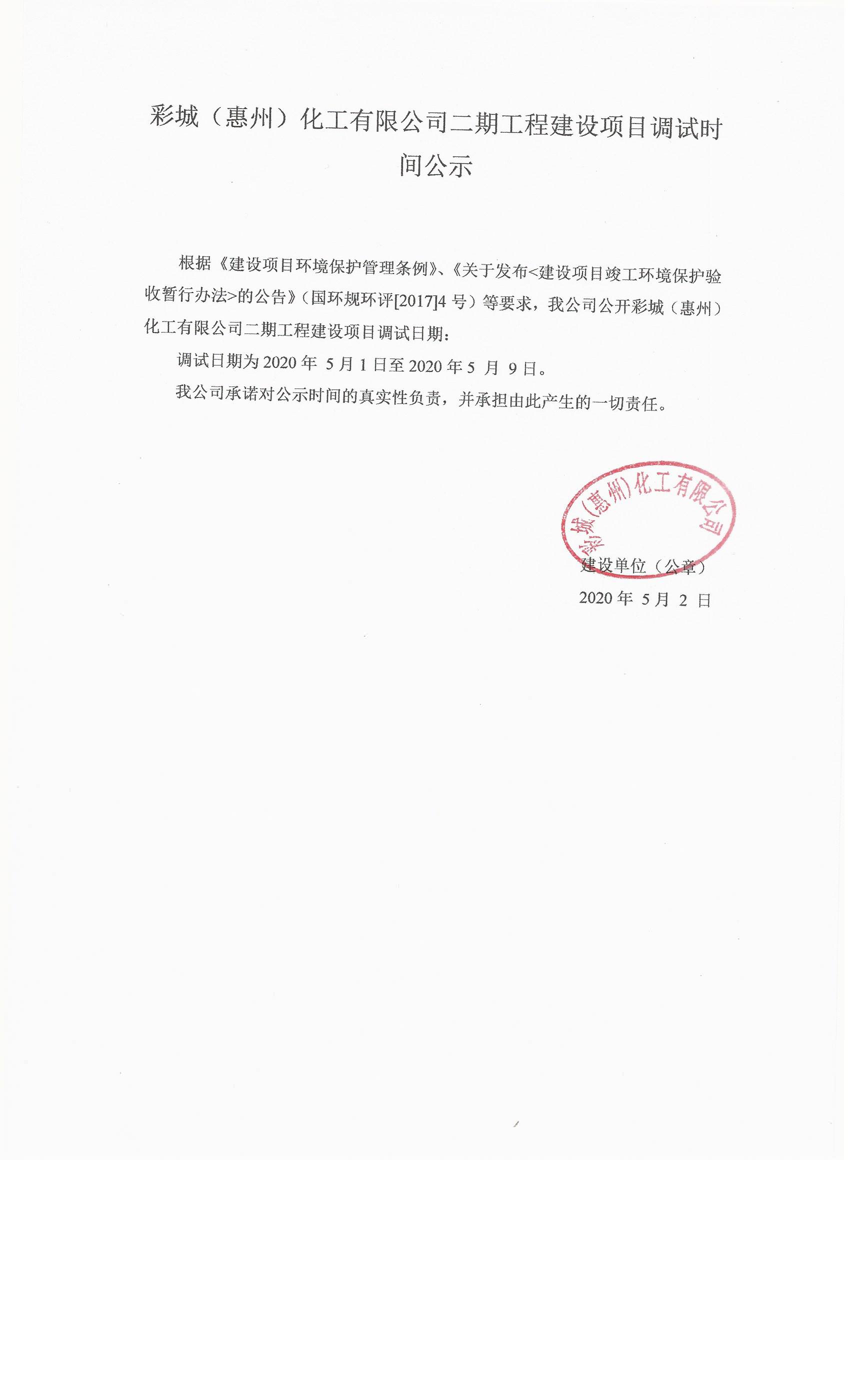 彩城(惠州)化工有限公司二期工程建设项目调试时间公示