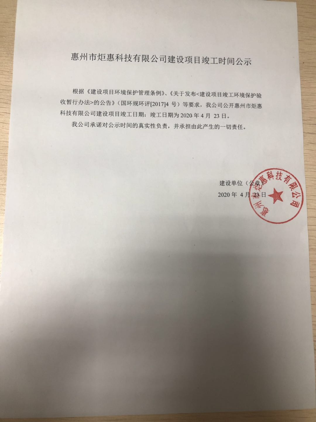 惠州市炬惠科技有限公司建设项目竣工时间公示