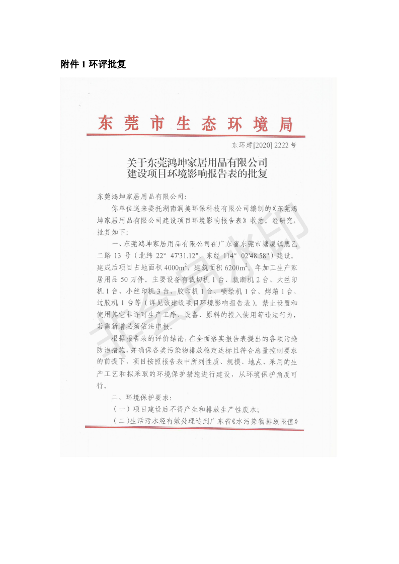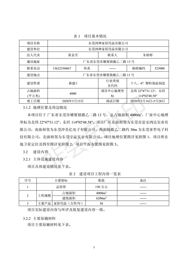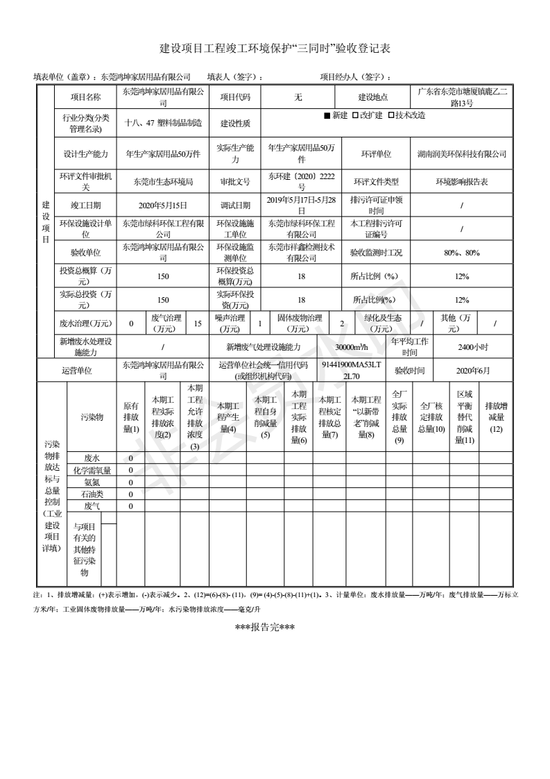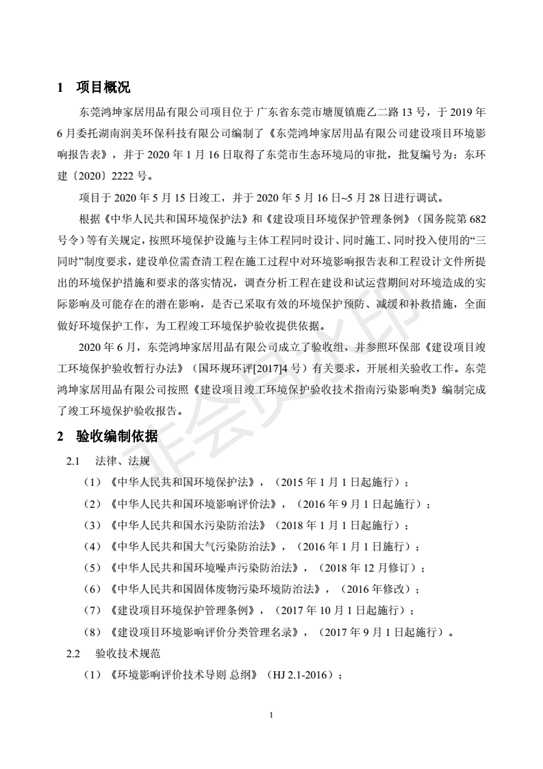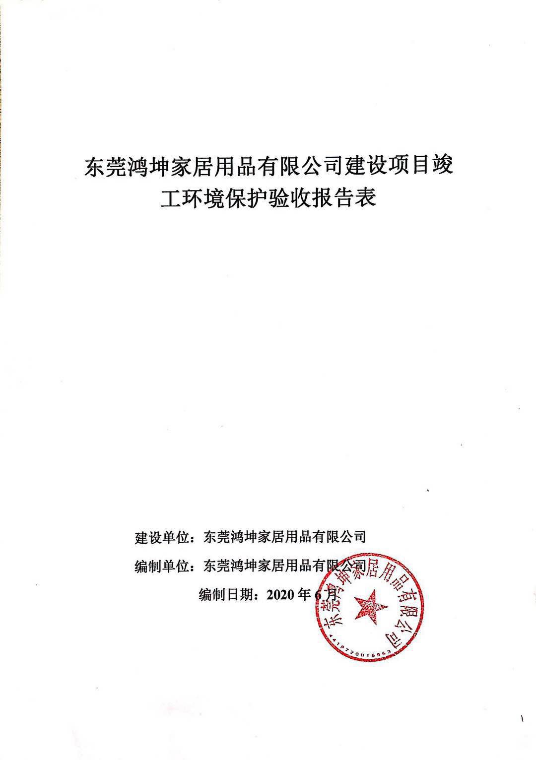 经验收现形成“东莞鸿坤家居用品有限公司建设项目竣工环境保护验收报告”现公开征求意见20个工作日,如有意见请反馈。 联系人:李聪,联系电话:18814145807,公示日期:2020年7月2日