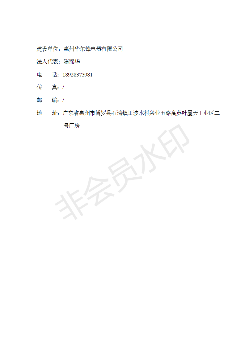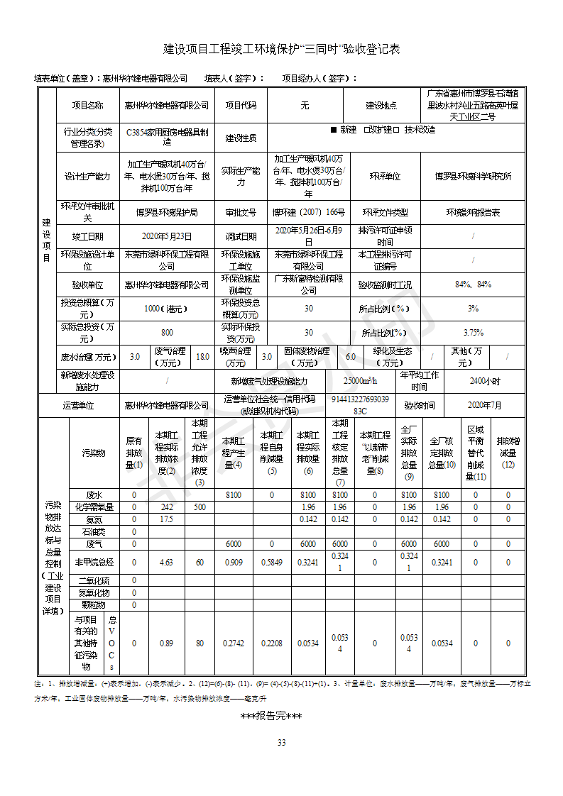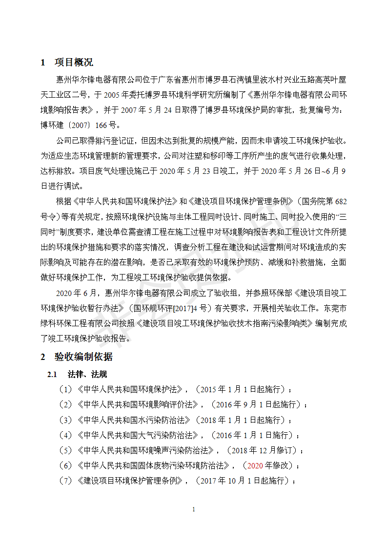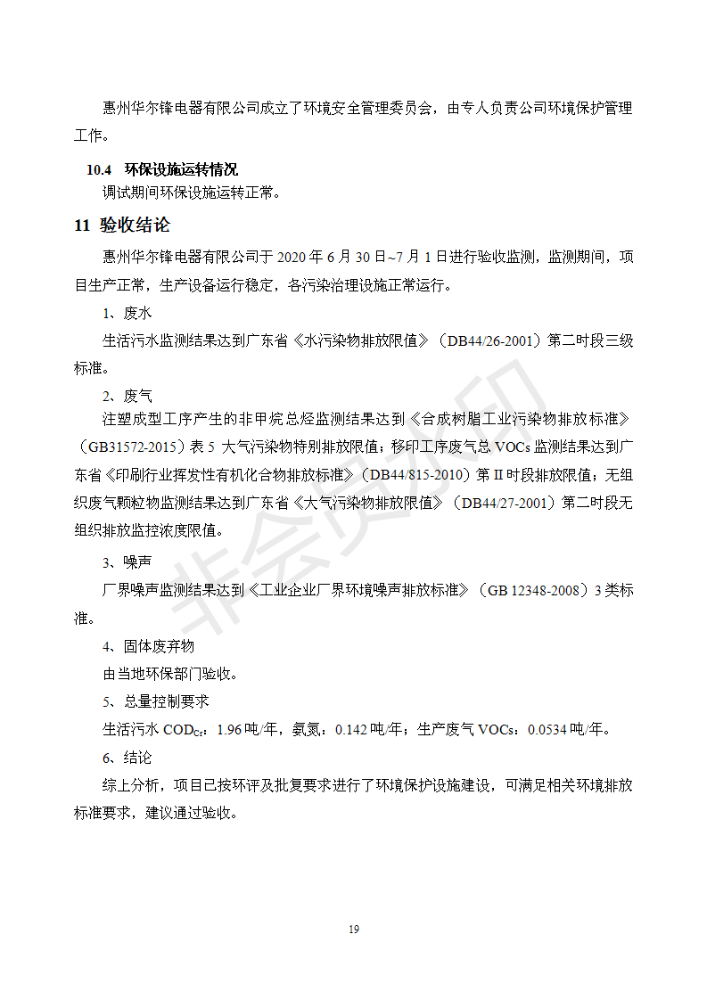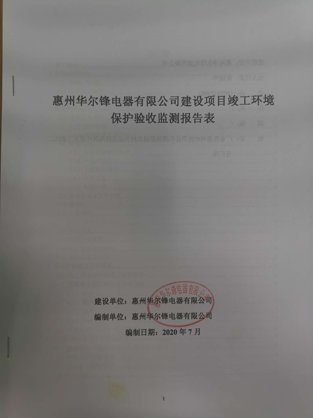 经验收现形成“惠州华尔锋电器有限公司建设项目竣工环境保护验收报告”现公开征求意见20个工作日,如有意见请反馈。 联系人:李聪,联系电话:18814145807,公示日期:2020年7月15日